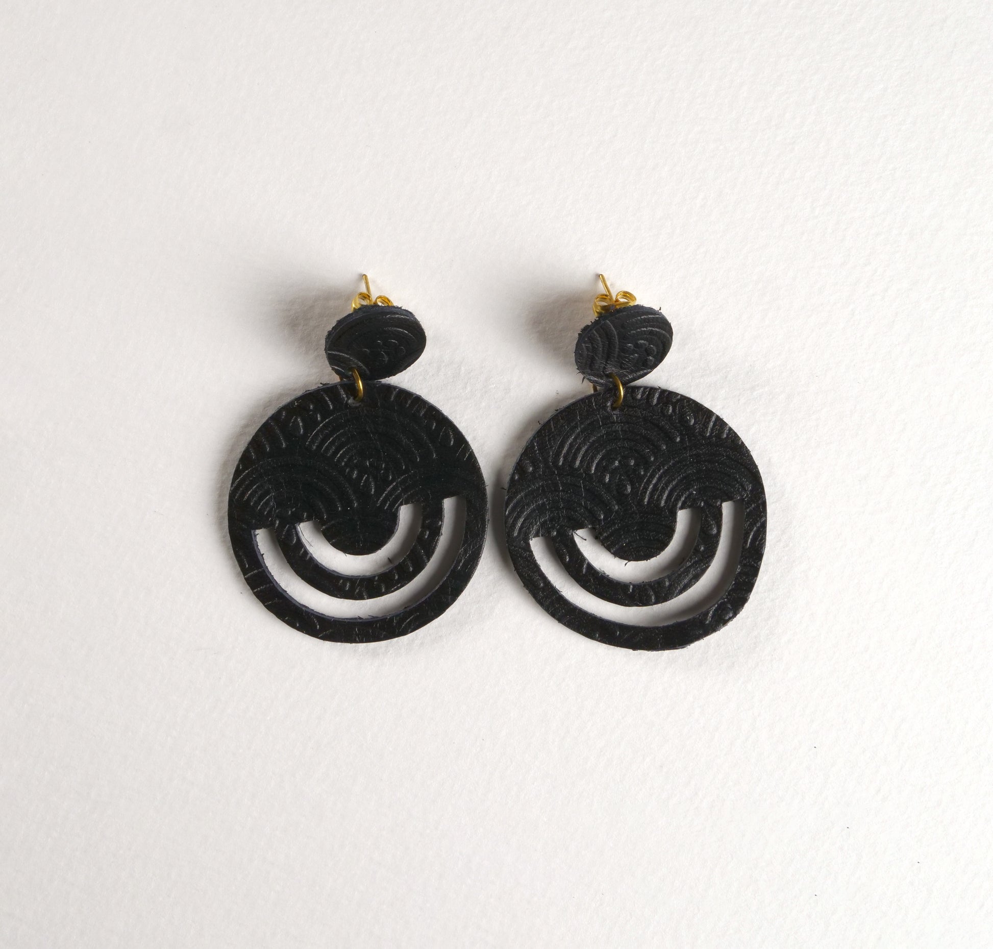 Disques en cuir noir audacieux, ornés d'un relief texturé saisissant et de découpes concentriques modernes.