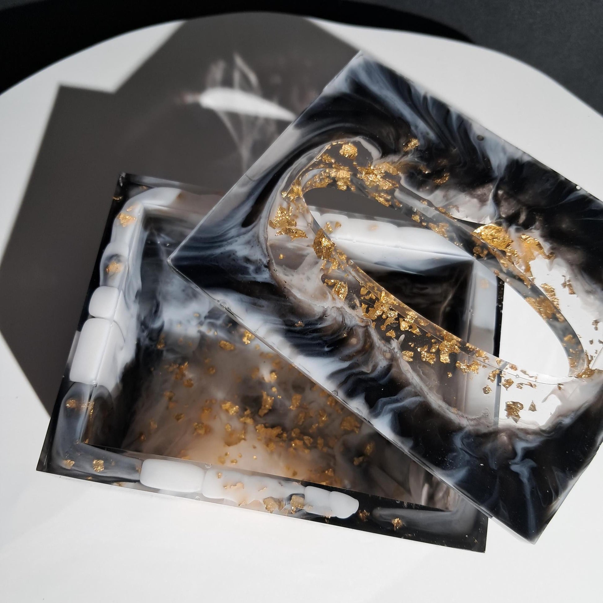 Cette boîte à mouchoirs fait-main en résine est verte avec des feuilles d'or donnant toute son élégance et son charme à l'objet. Parfait pour décorer votre entrée ou autres pièces de la maison et poser vos bijoux, clés et pièces dessus. Ou pour offrir en cadeau.