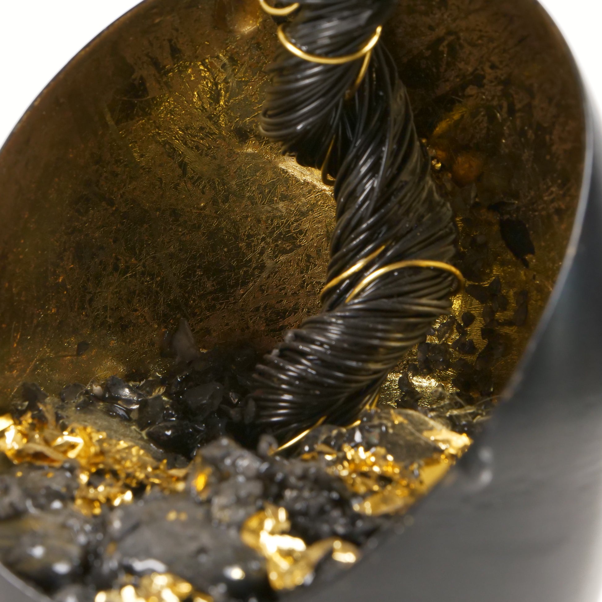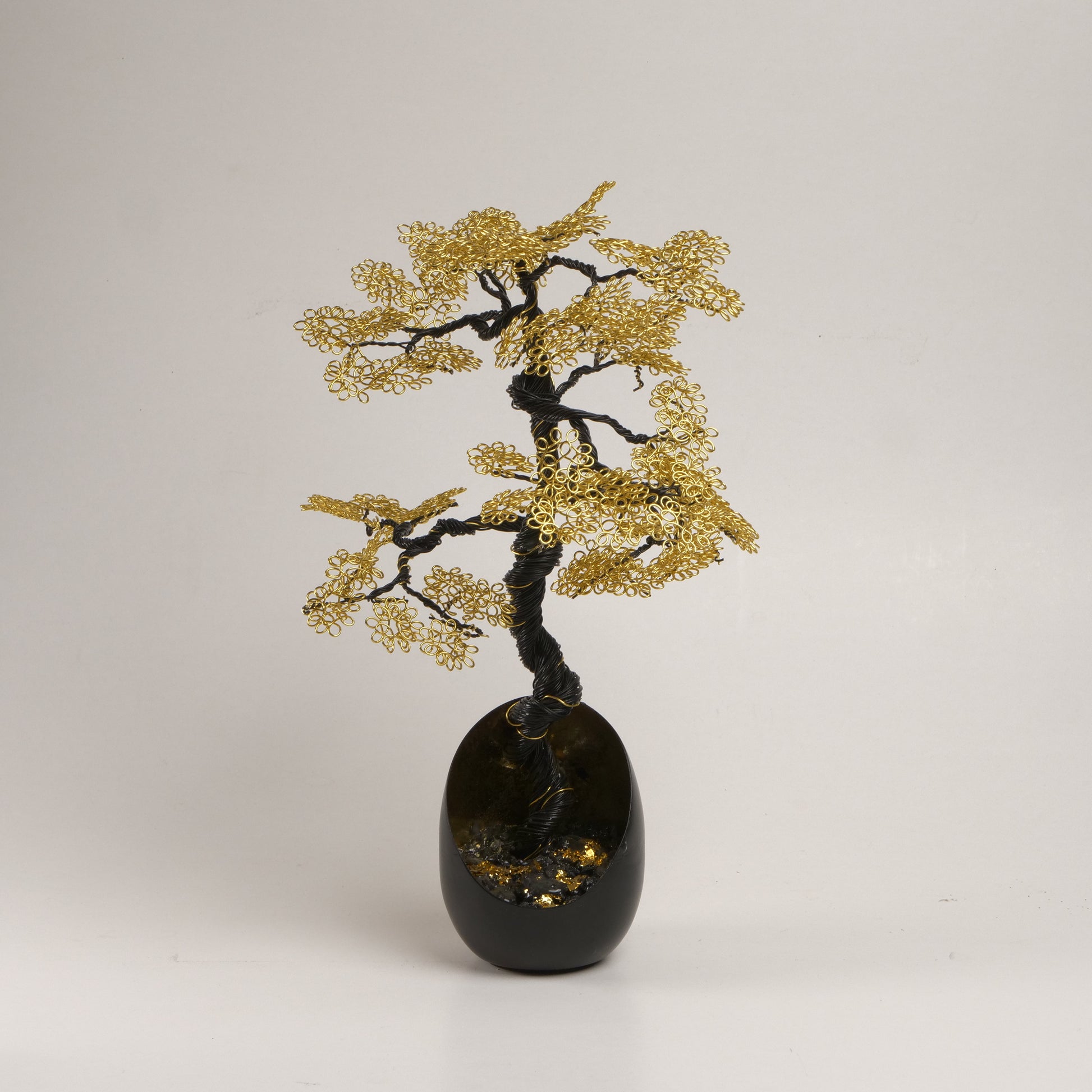 Un fil d'or classique, tressé en un magnifique tronc inspiré des bonsaïs, et des branches épurées et élégantes. Le tout est présenté dans un vase noir poli, mettant en valeur la luminosité et le raffinement du fil.
