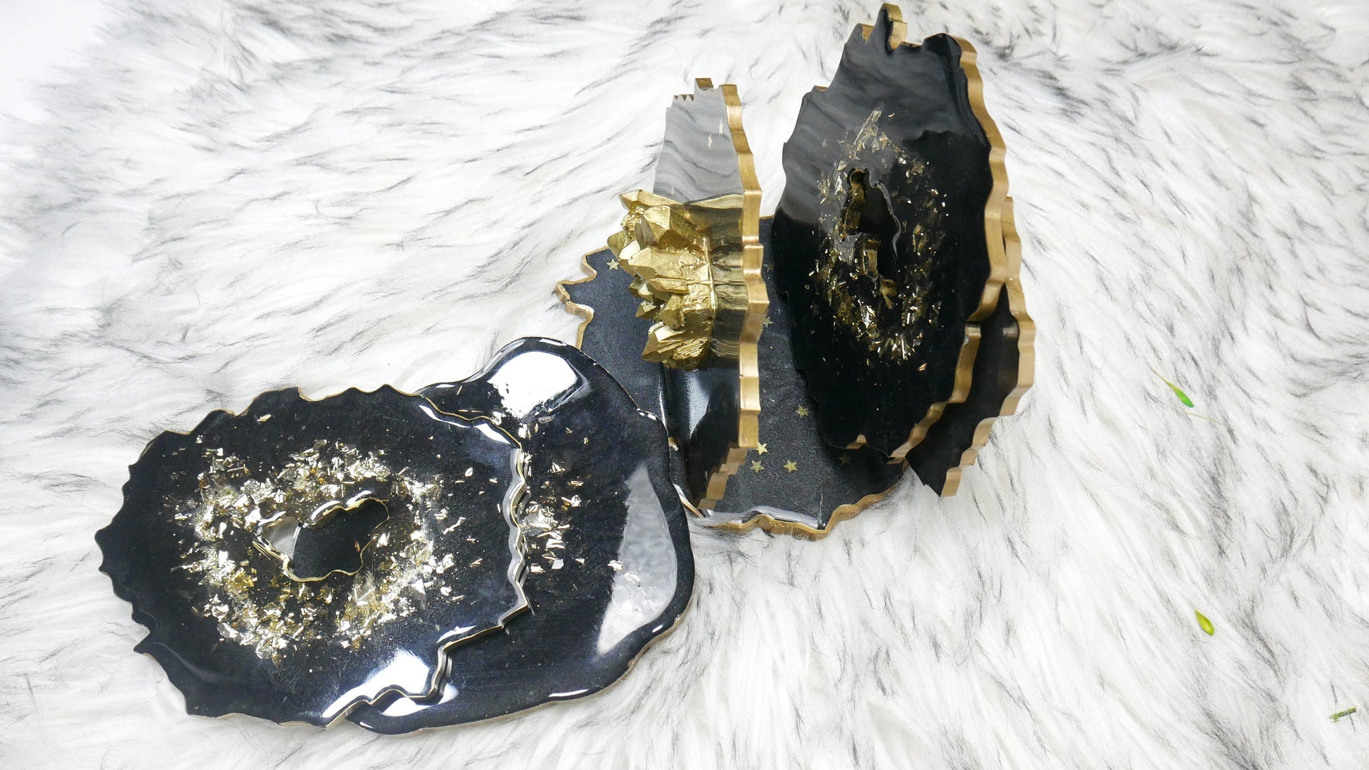 Un magnifique dessous de verre fabriqué à la main en résine liquide. Les couleurs noir et or ont été ajoutées à la résine pour créer un effet géode. Idéal pour ajouter une touche de luxe à votre intérieur.