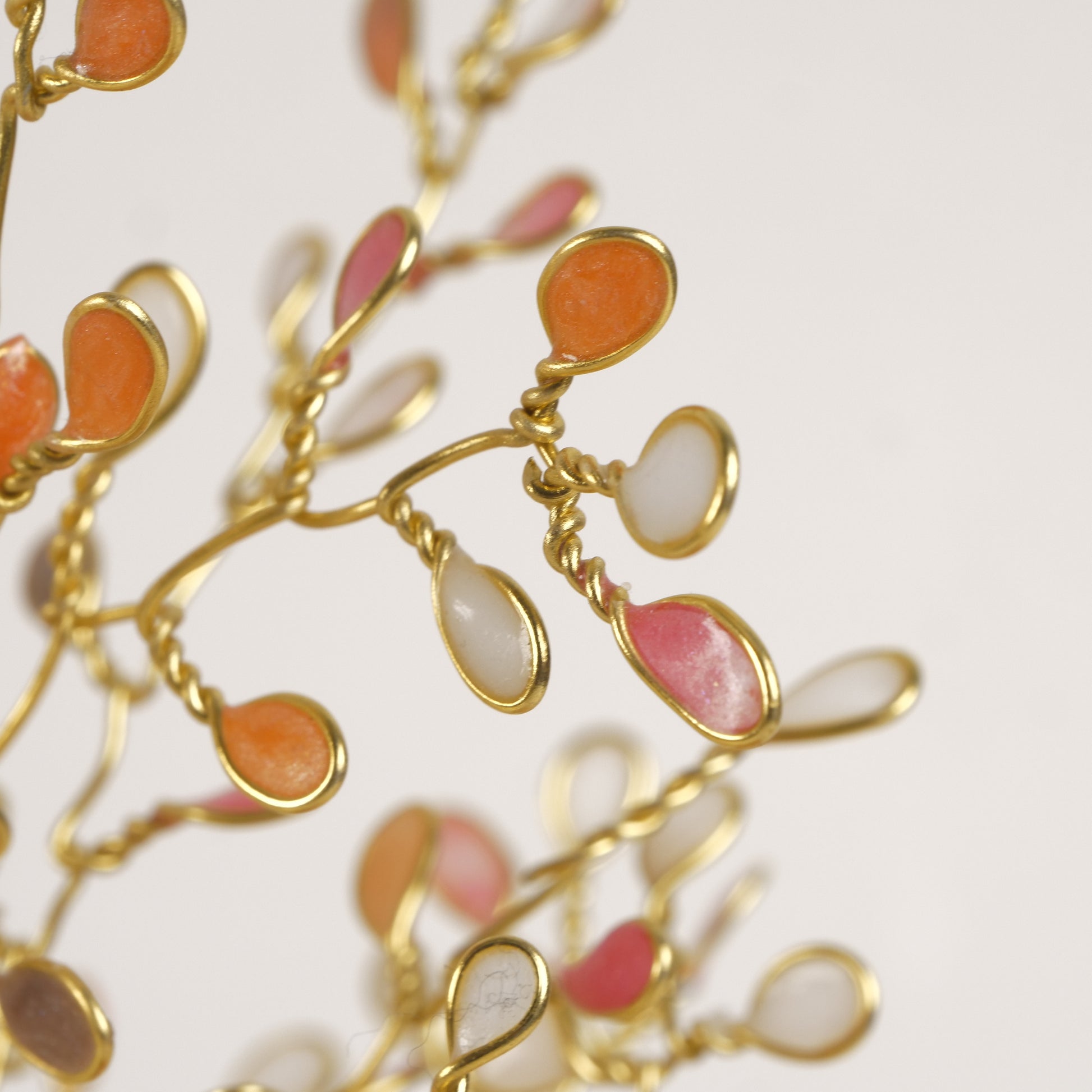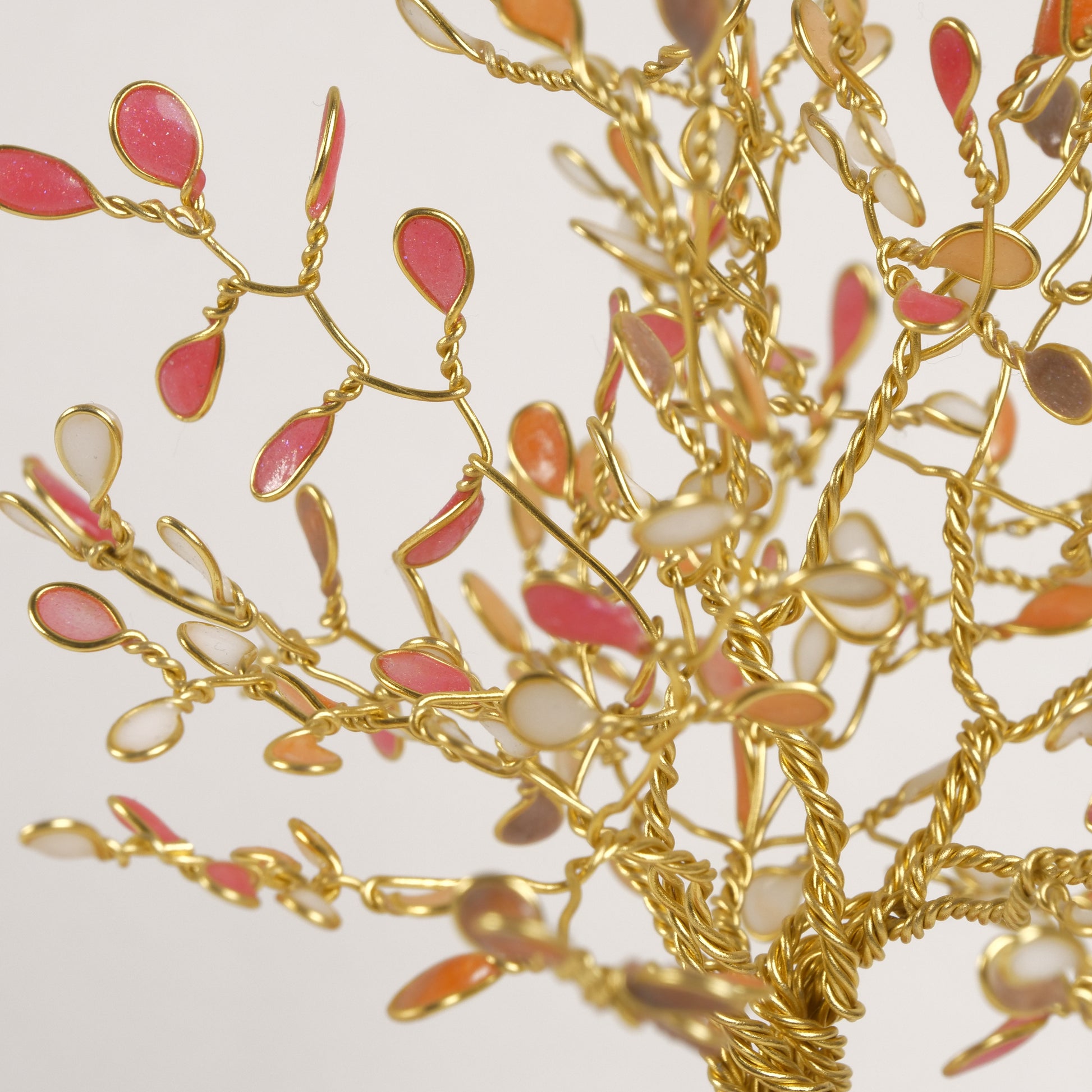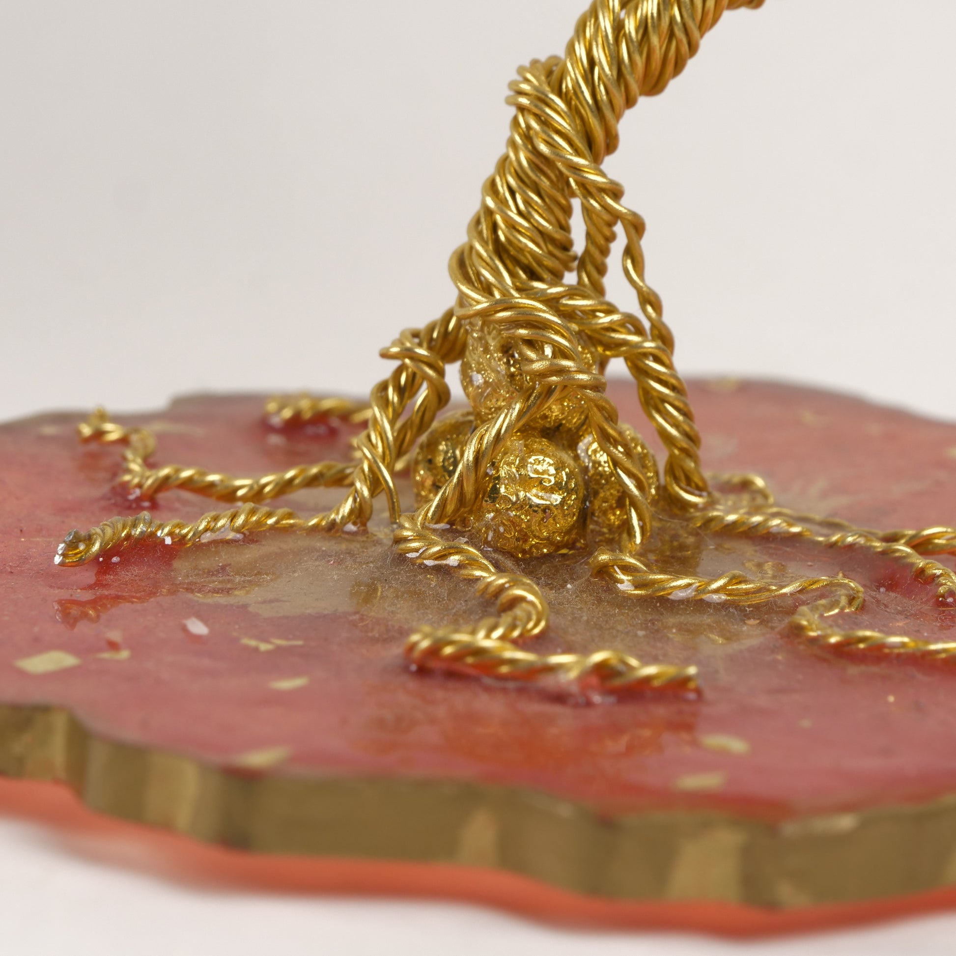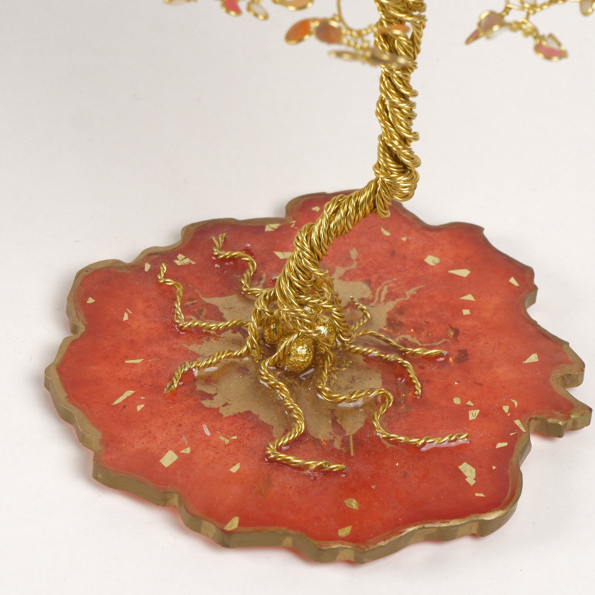 Un arbre miniature captivant, entièrement réalisé à la main à partir de fil d'or, orné de feuilles perlées aux reflets flamboyants. Fixé sur un socle en résine aux volutes raffinées, il offre une présentation à la fois vibrante et luxueuse.