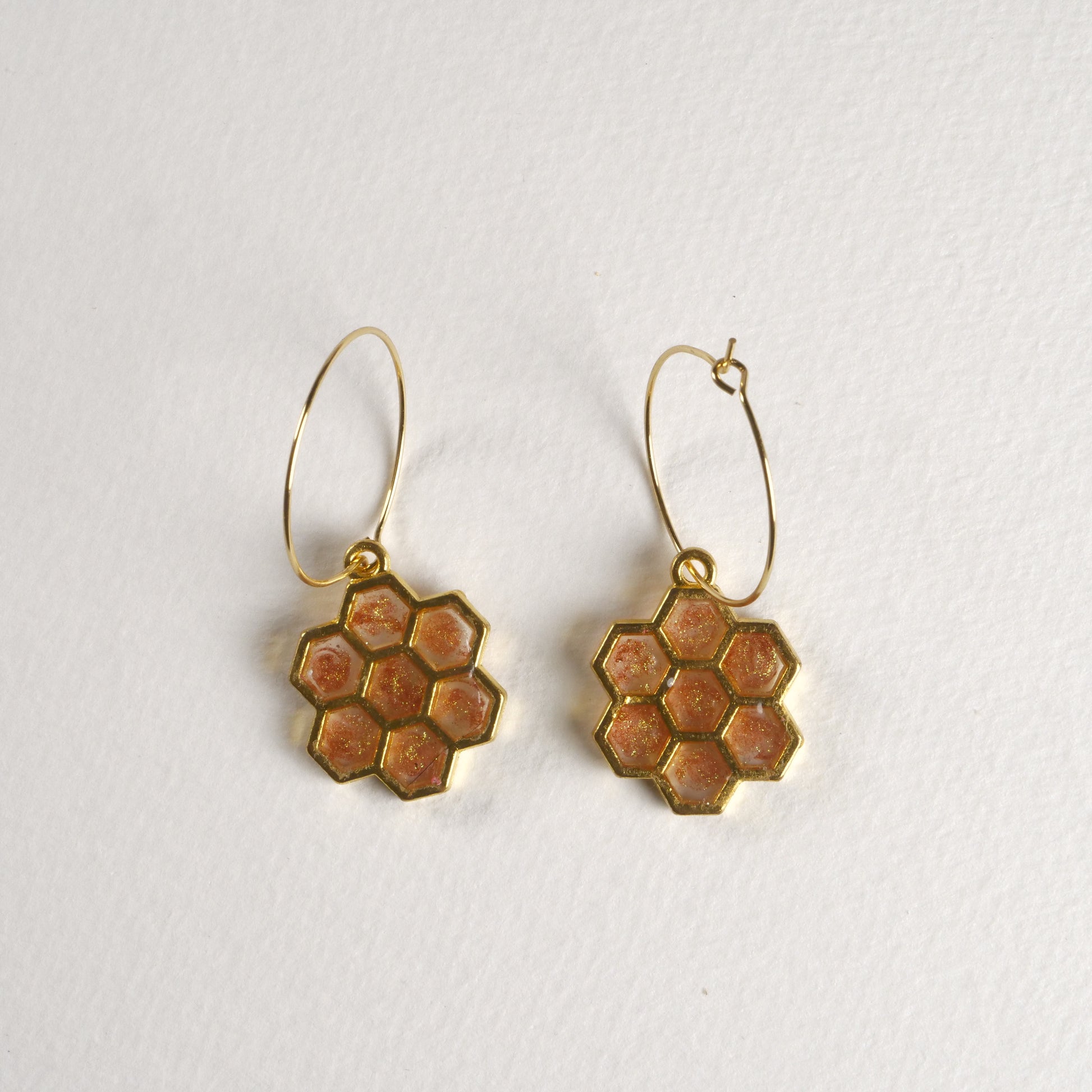 Boucle d'oreille en forme de nid d'abeille dorés, garnis d'une résine ambrée chaleureuse et de délicats accents pailletés.