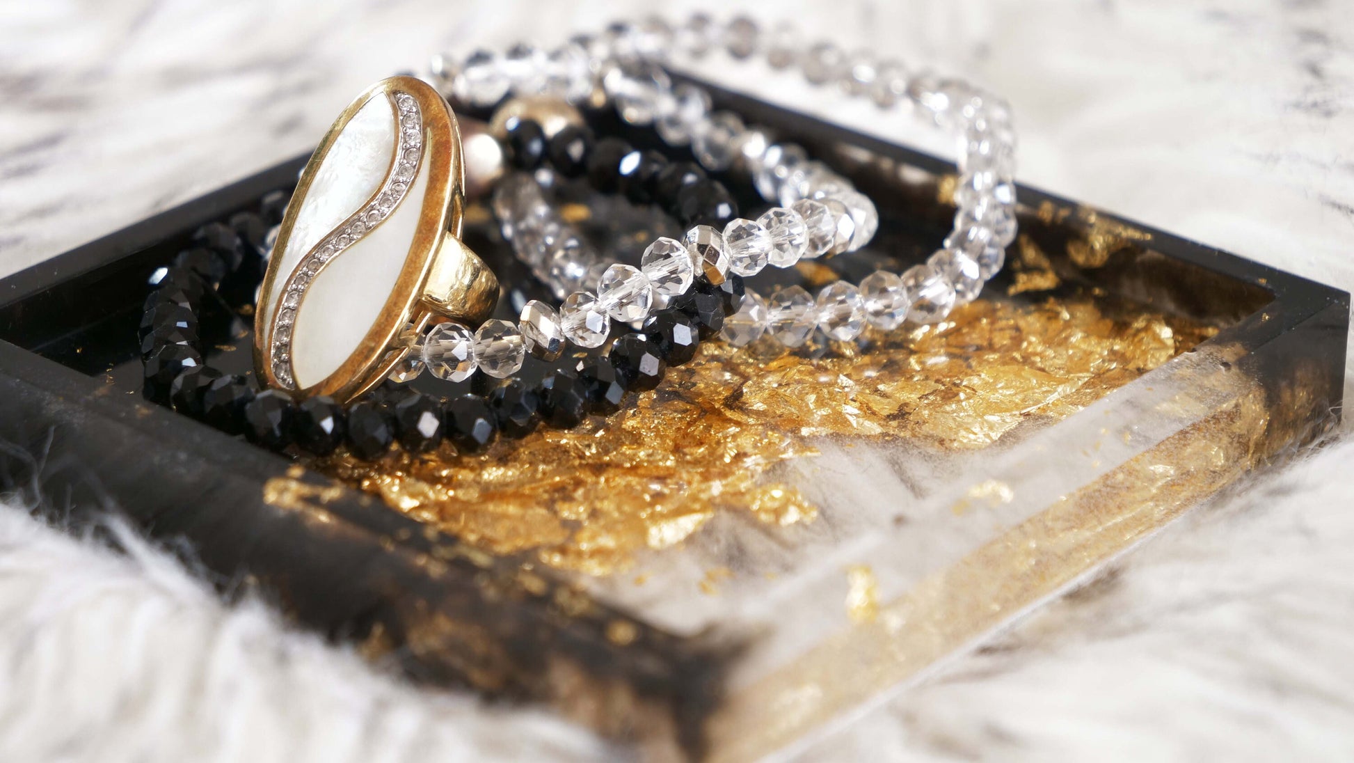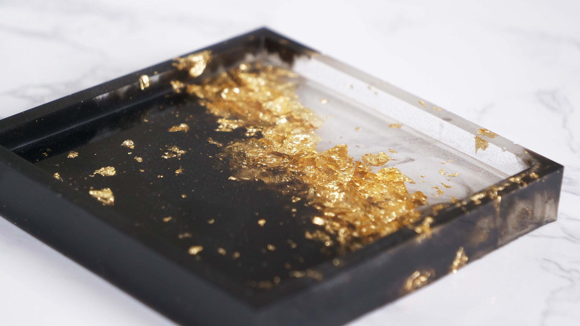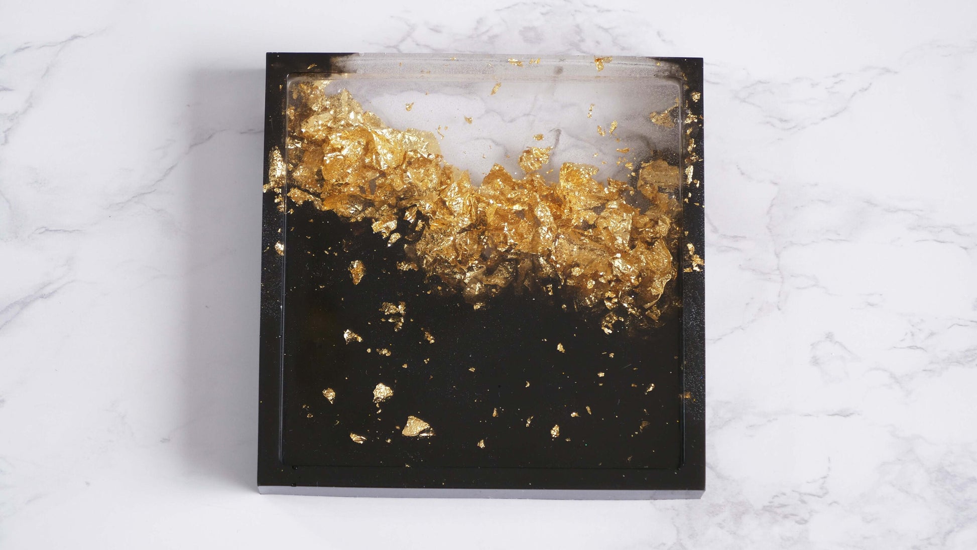 Ce dessous de verre en résine fait main est noir et orné de feuilles d'or qui lui confèrent toute son élégance et son charme. Idéal pour décorer votre entrée ou d'autres pièces de la maison, il peut accueillir bijoux, clés et argent. Ou pour offrir.