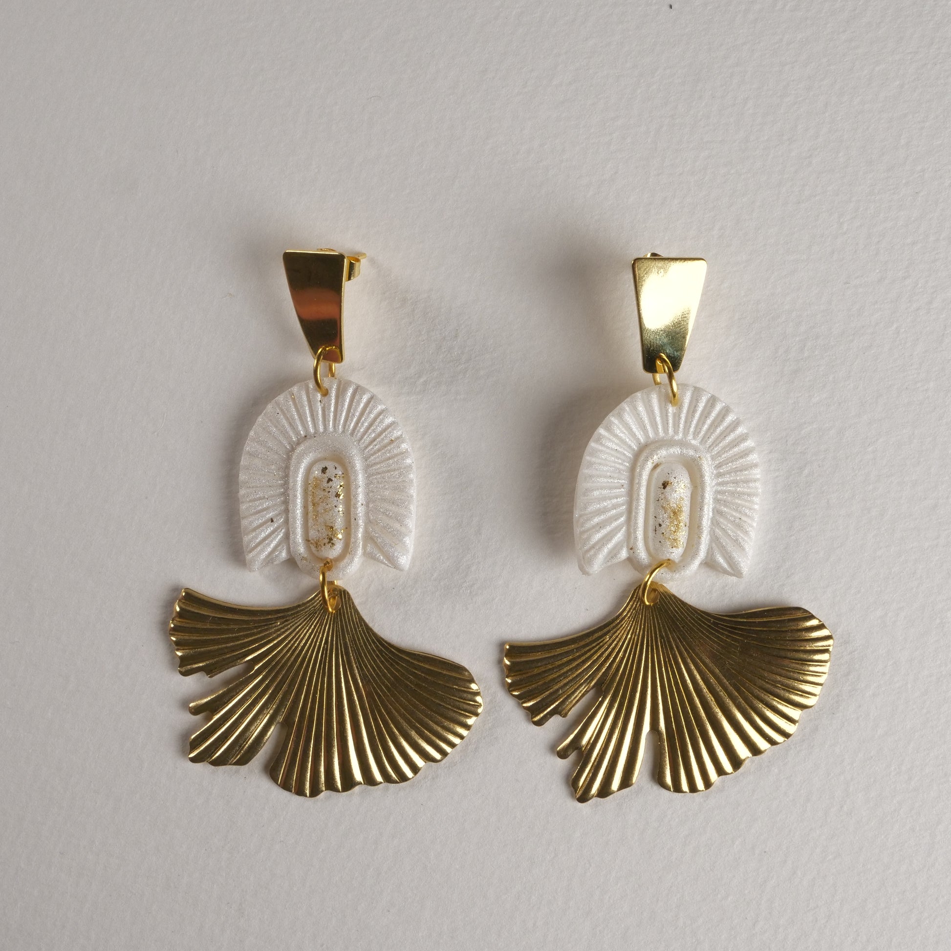 Superbes pendants en techniques mixtes, combinant une arche en polymère blanc texturé et un audacieux éventail Ginkgo doré poli. Un design Art déco sophistiqué.