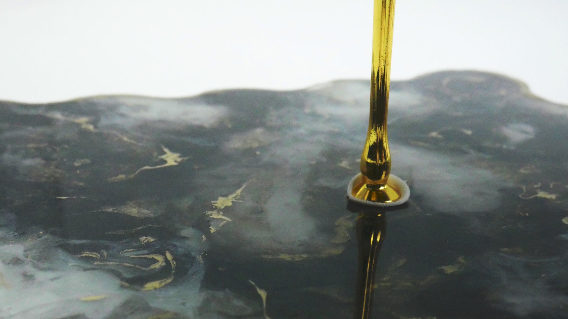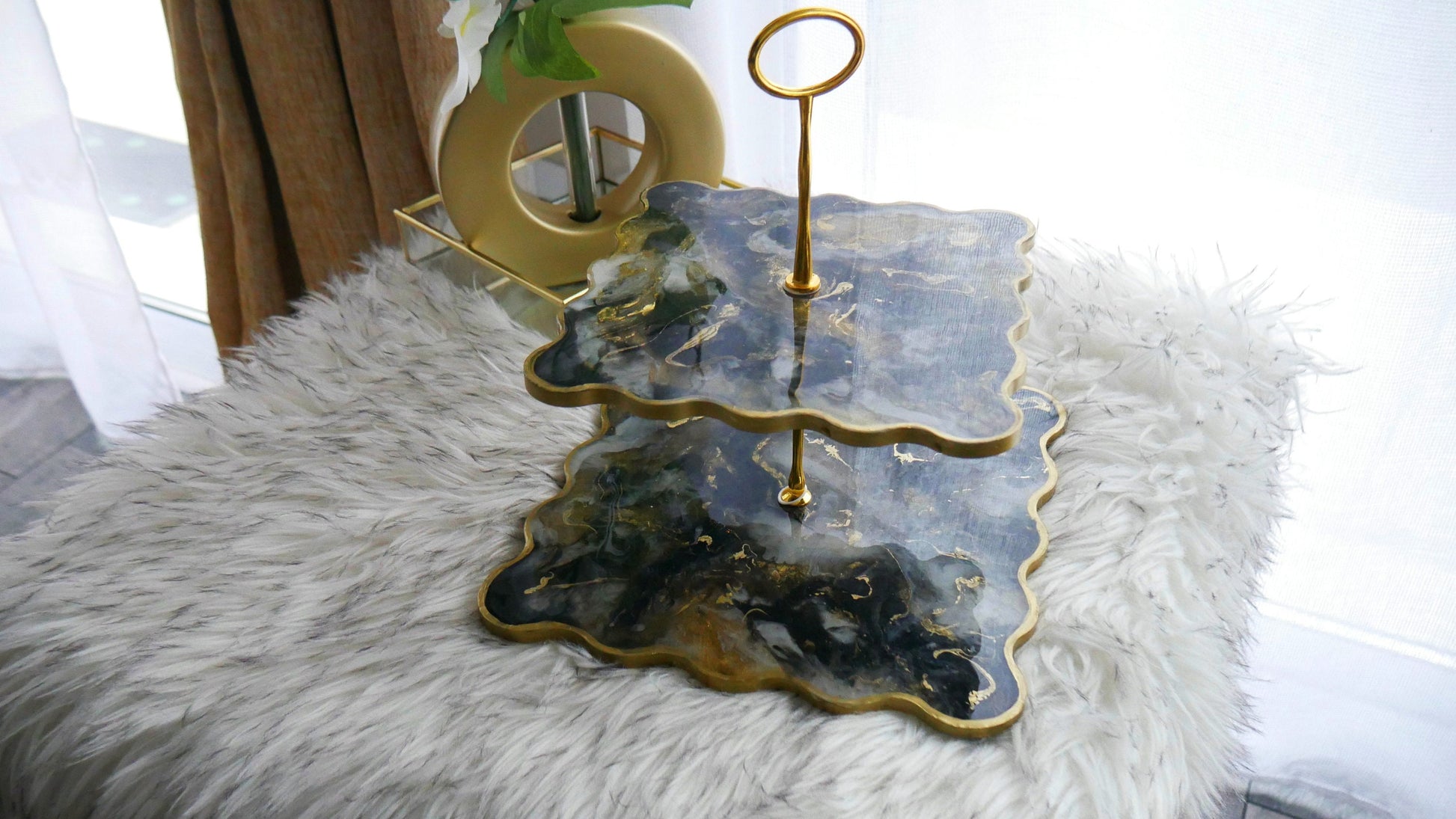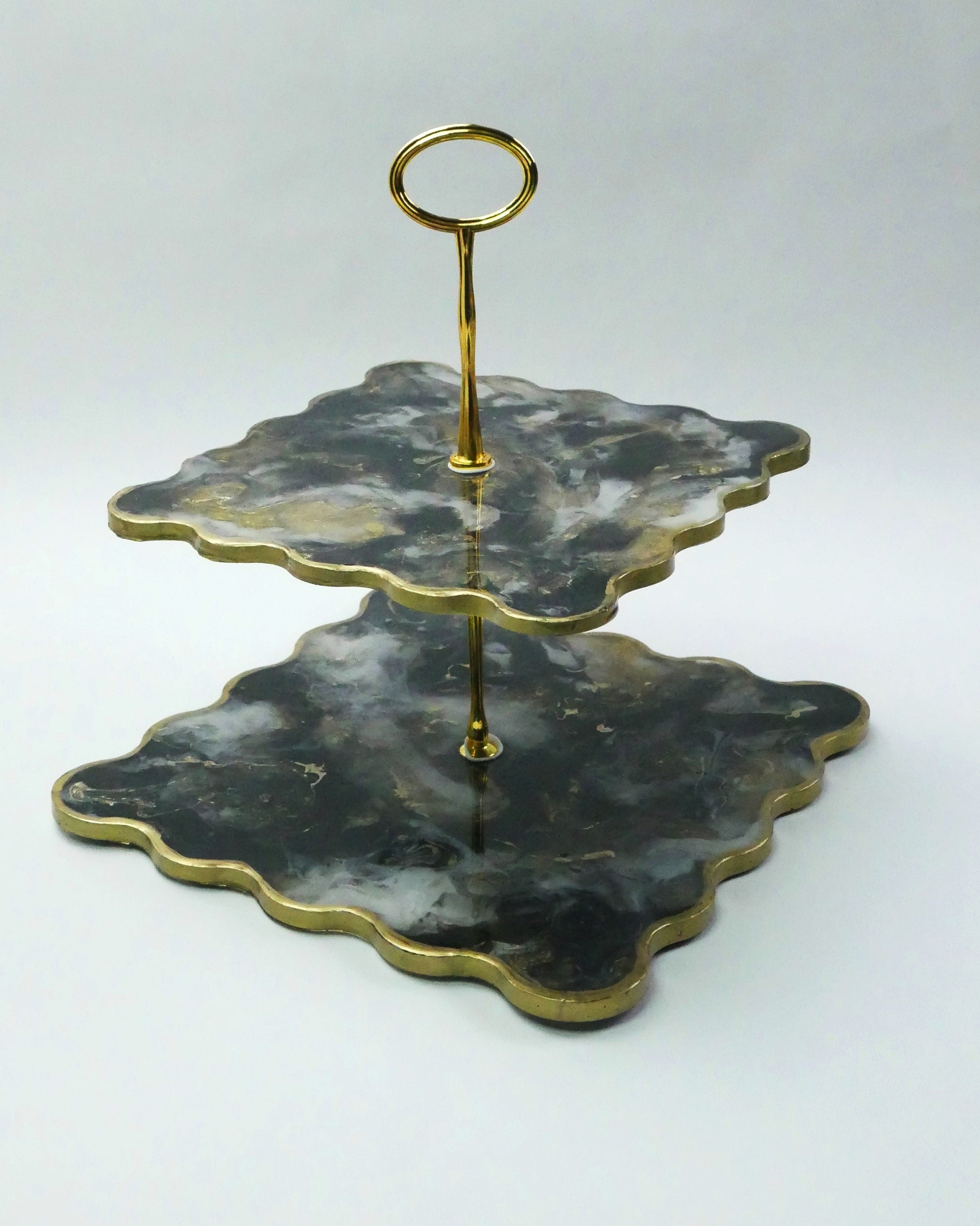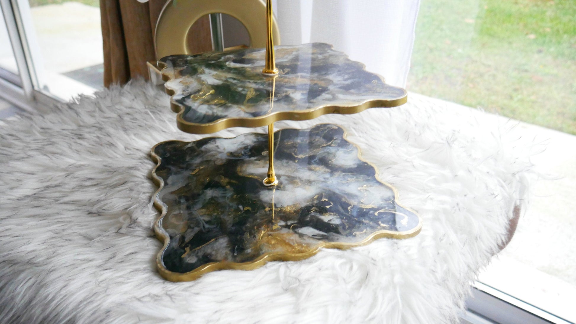 Un magnifique présentoir à gâteaux à deux étages, réalisé à la main avec de la résine liquide. Des touches de noir et de lignes dorées ont été ajoutées à la résine pour un effet marbré et une touche d'élégance supplémentaire. Idéal pour une touche de luxe dans votre intérieur.
