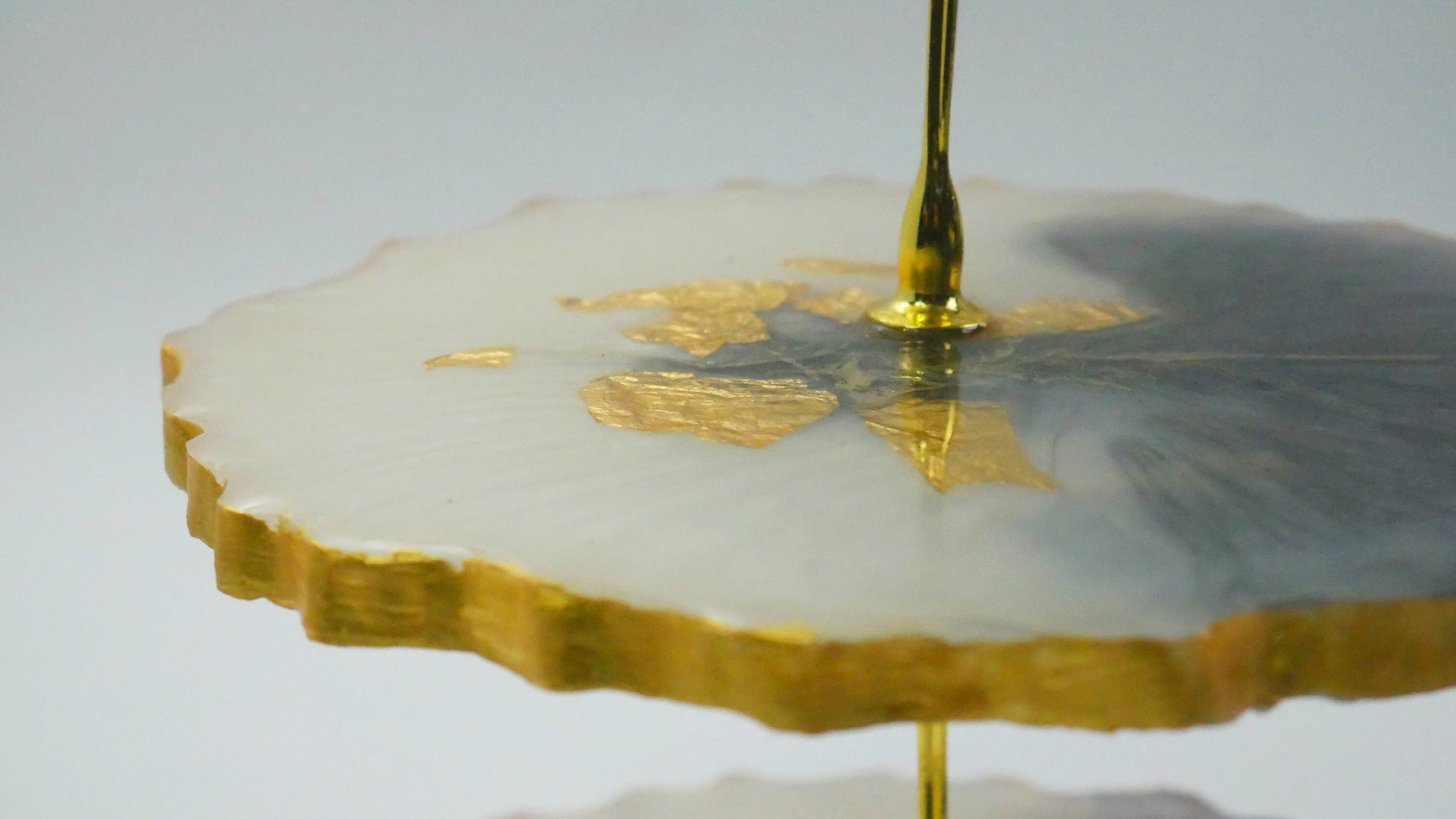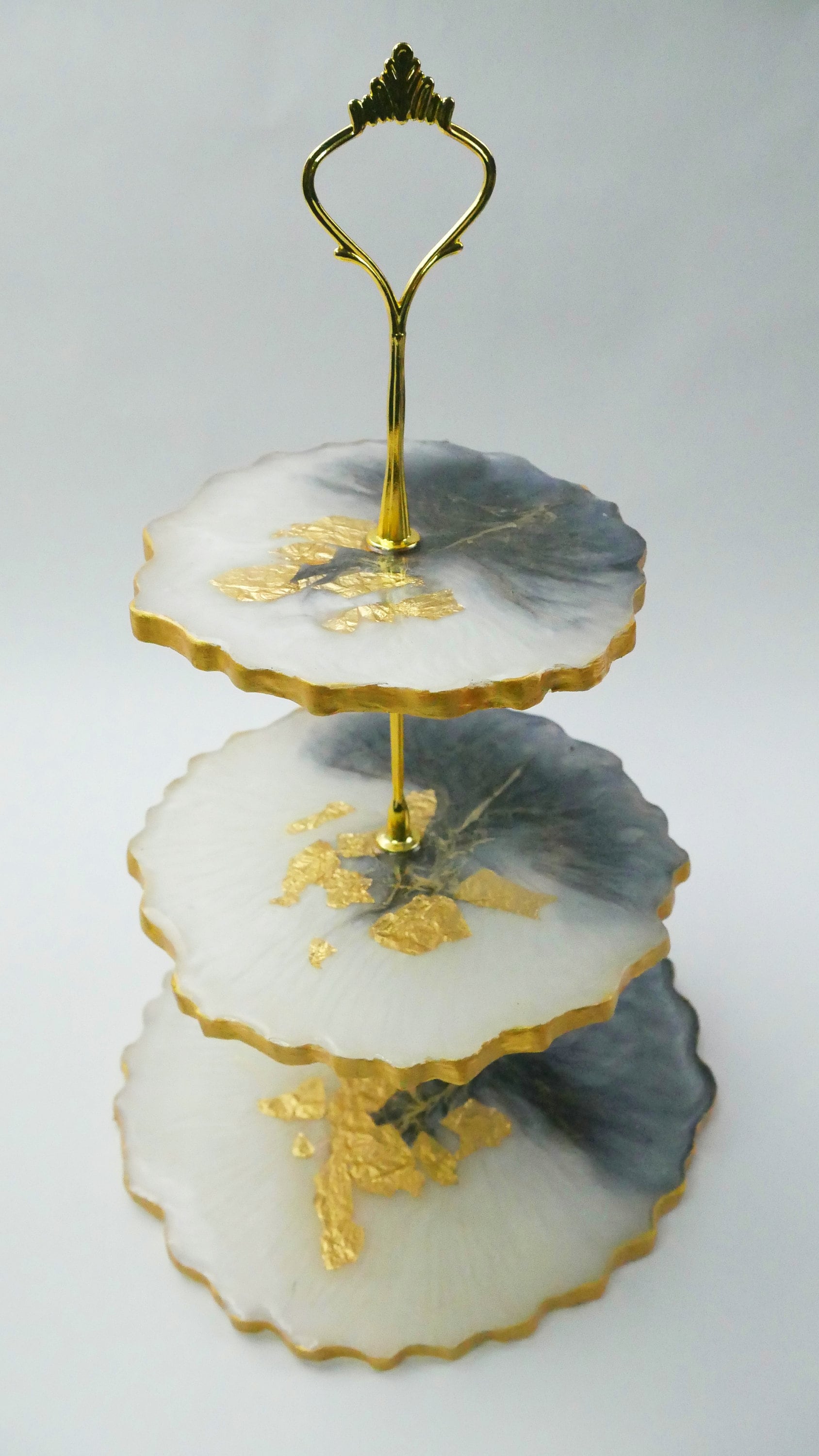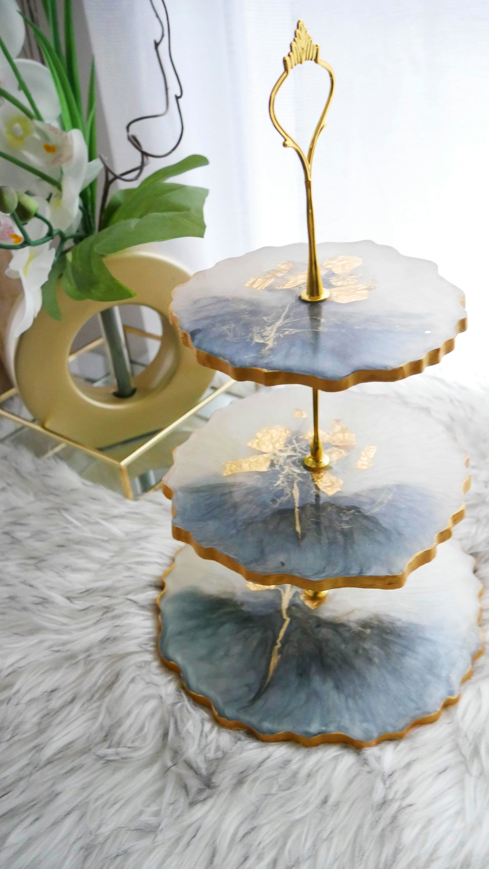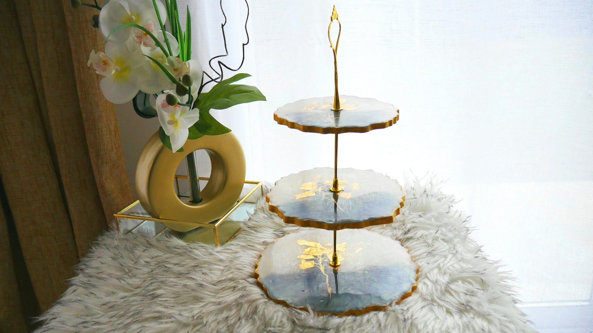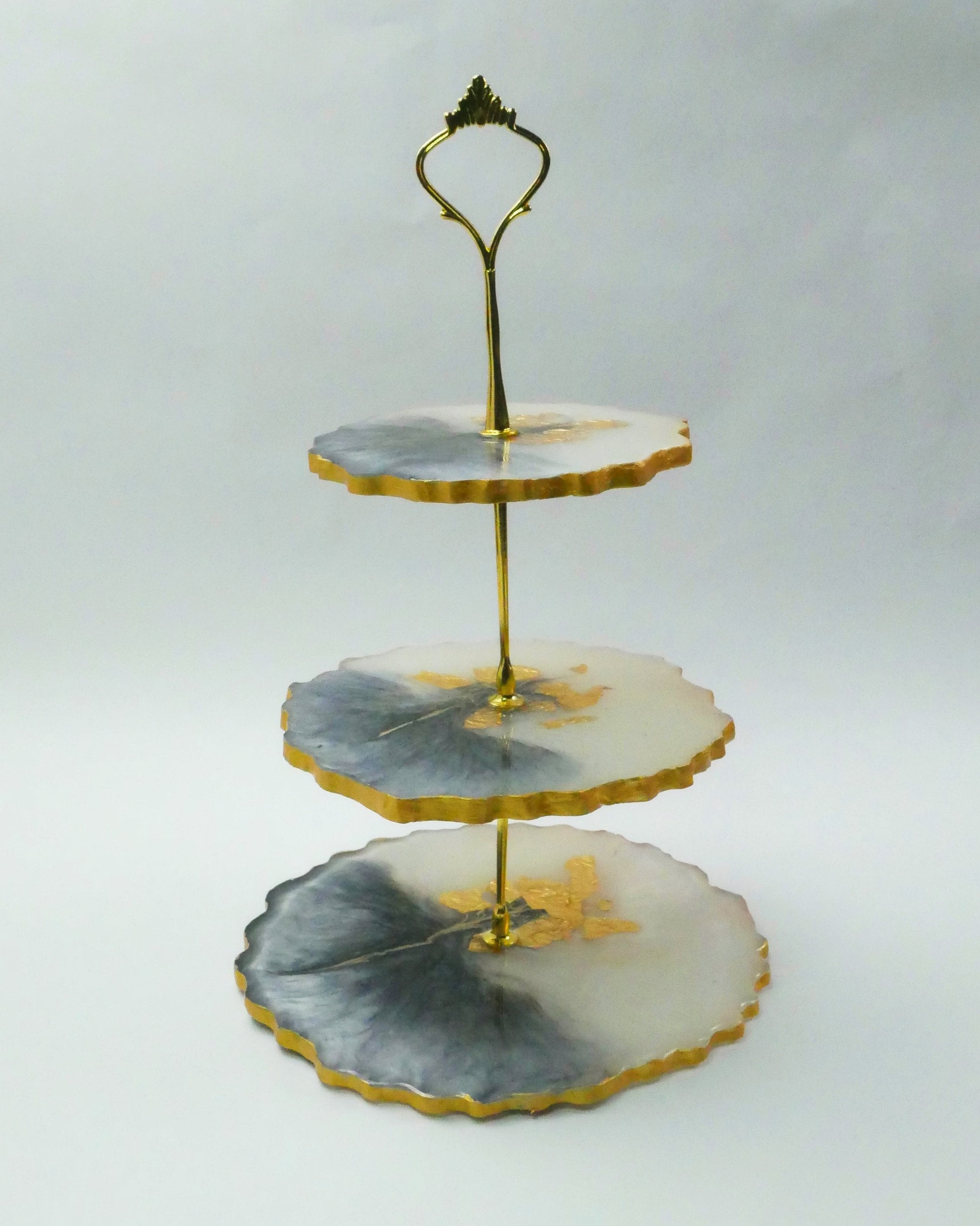 Un magnifique présentoir à gâteaux à trois étages, réalisé à la main avec de la résine liquide. Des nuances grises ont été ajoutées à la résine pour un effet marbré, tandis que des feuilles dorées apportent une touche d'élégance supplémentaire. Idéal pour une touche de luxe à votre intérieur.