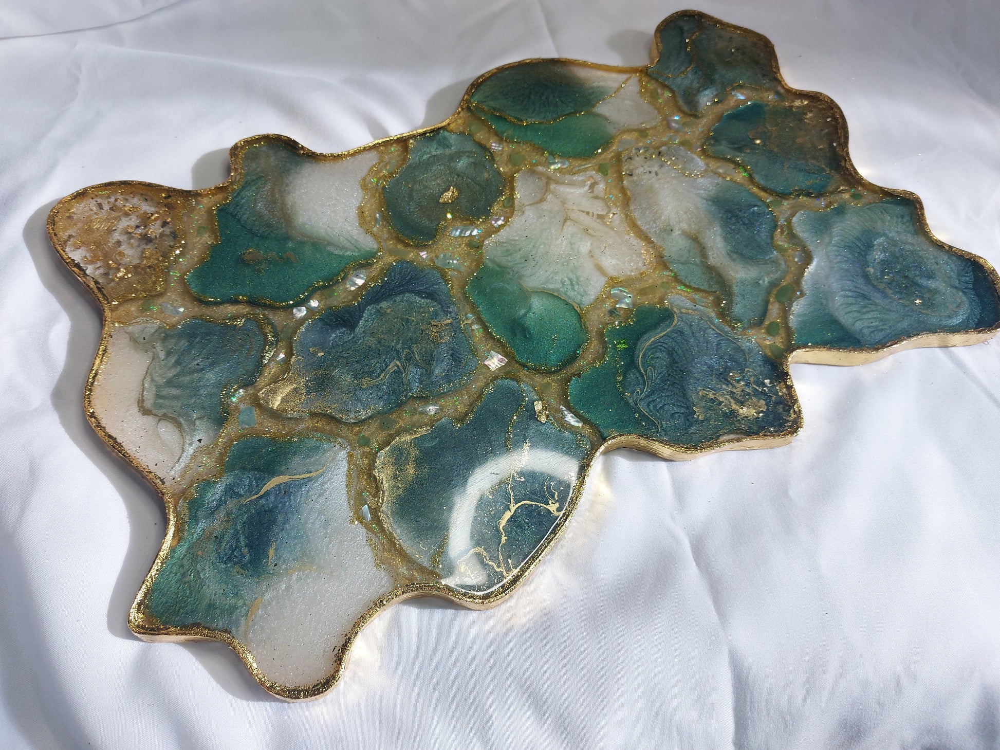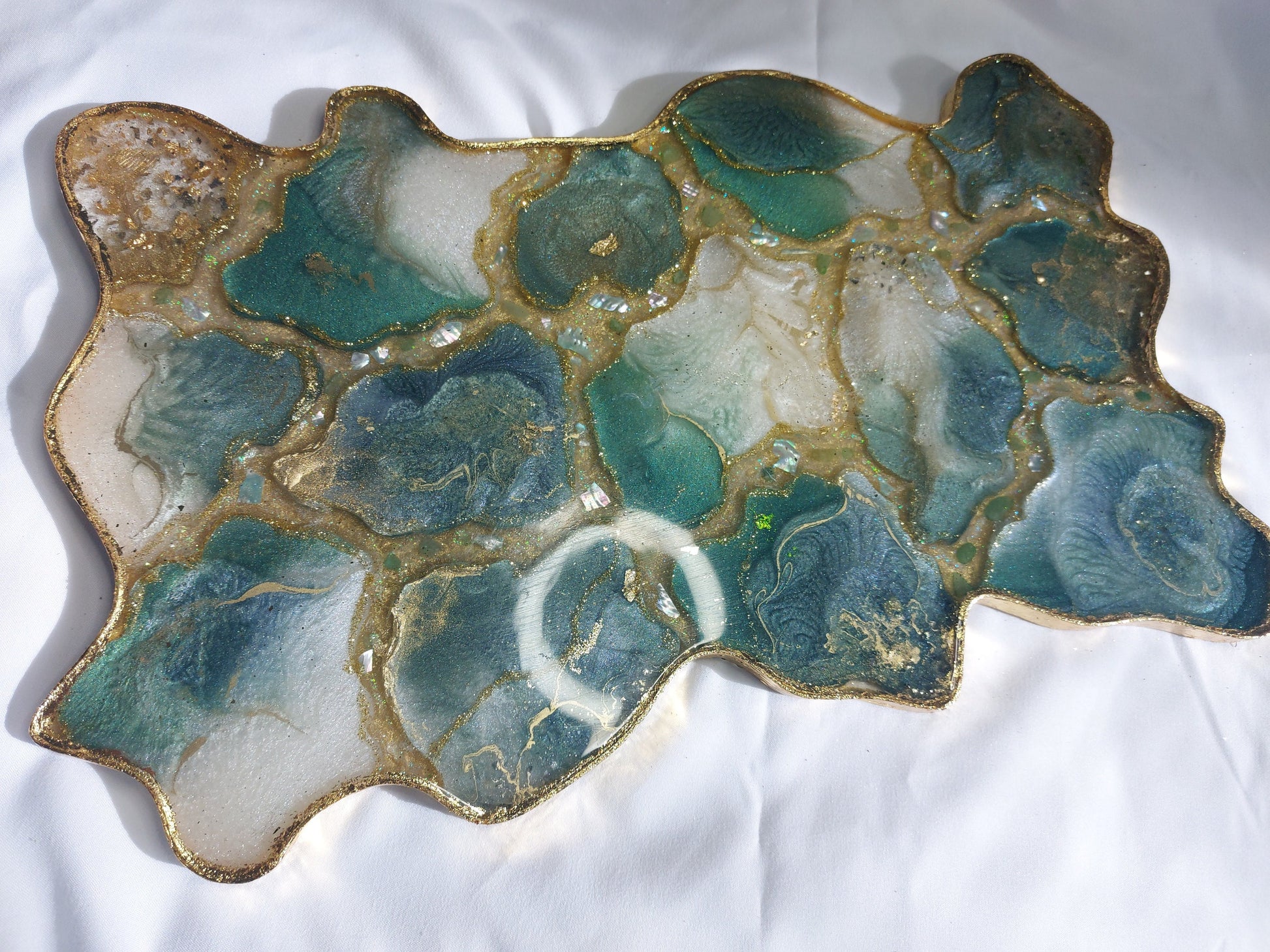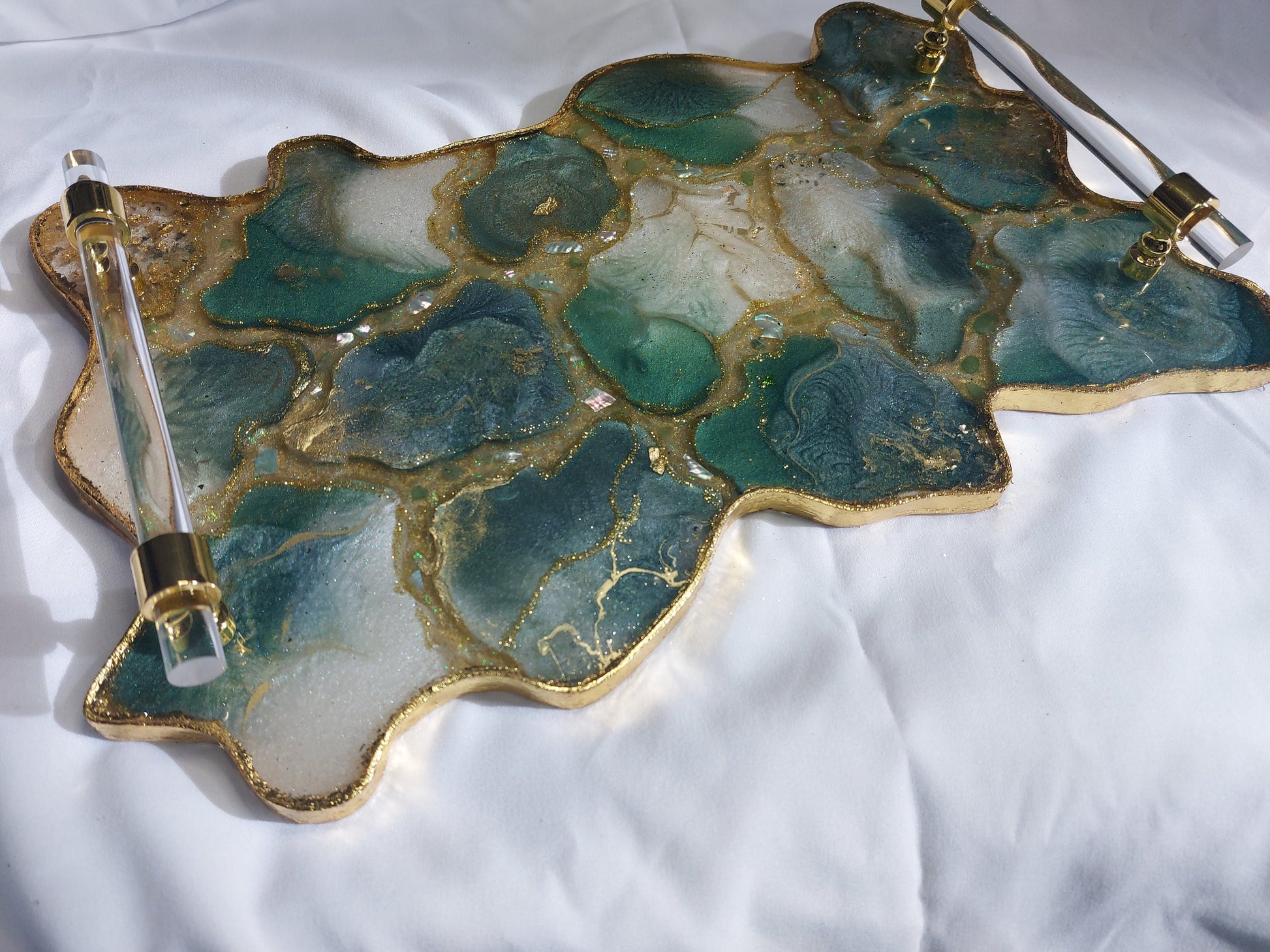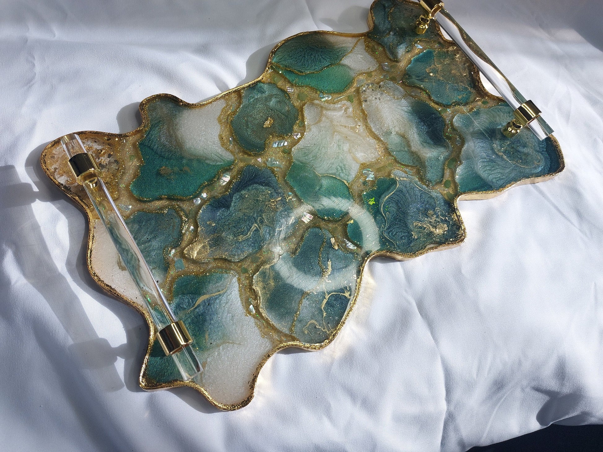 Ce plateau de prestige, fabriqué à la main en résine et doté de belles et fines poignées dorées, est orné d'un motif géode et marbre, rehaussé de paillettes scintillantes et de perles de coquillage colorées. Pour une touche d'élégance supplémentaire, des feuilles d'or ont été ajoutées sur les bords. Idéal pour décorer votre intérieur, y déposer vos boissons, exposer vos bijoux, vos parfums ou pour offrir.