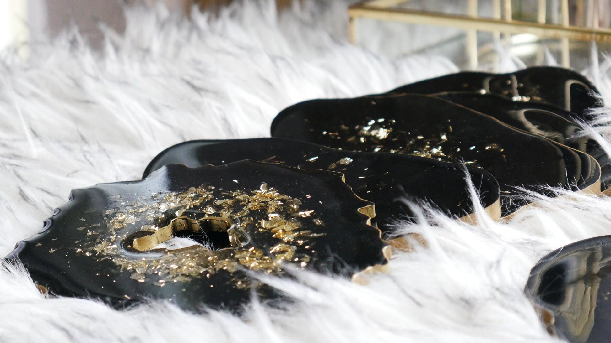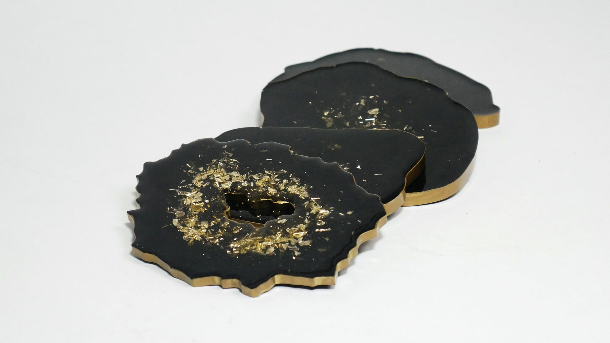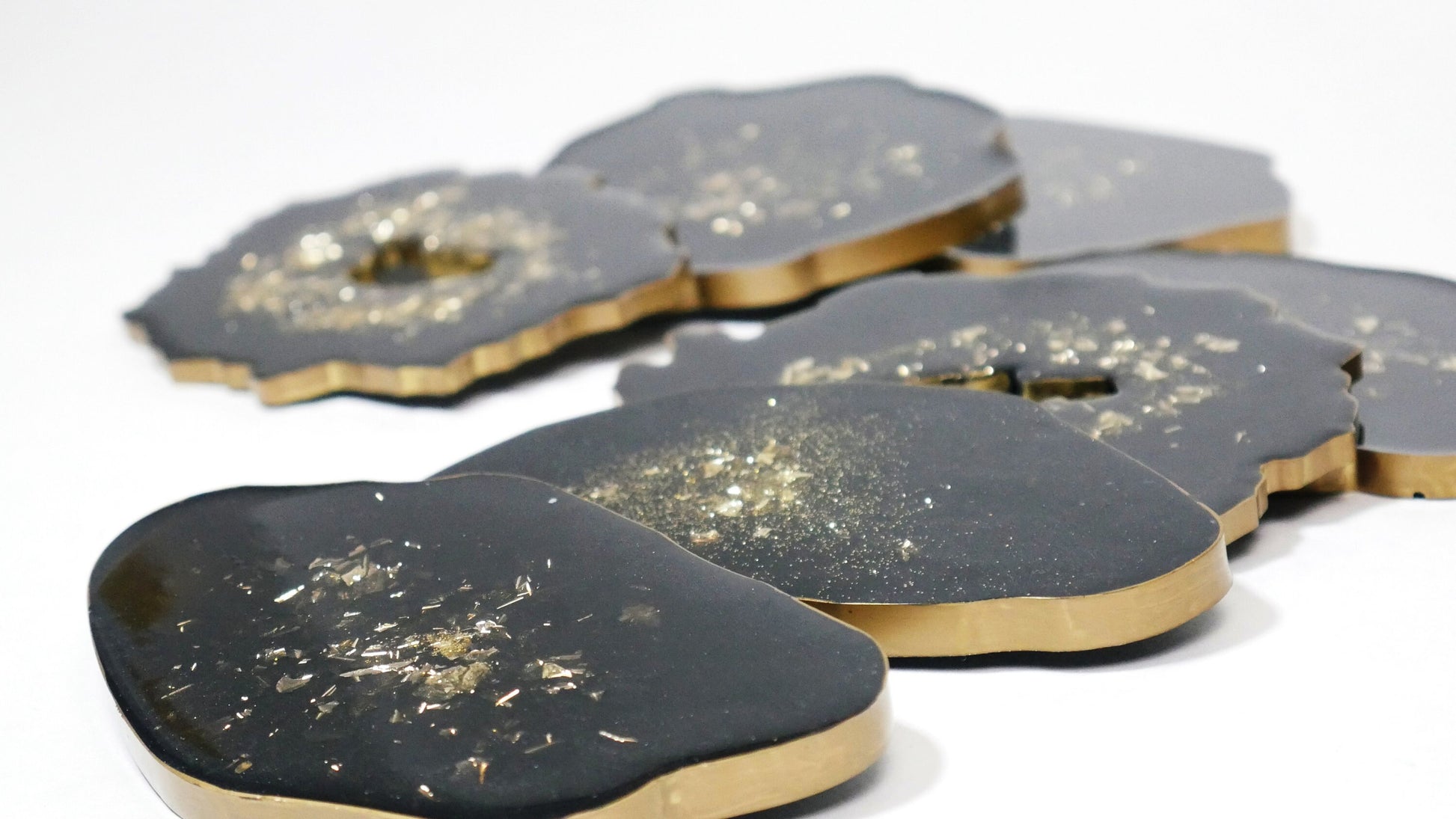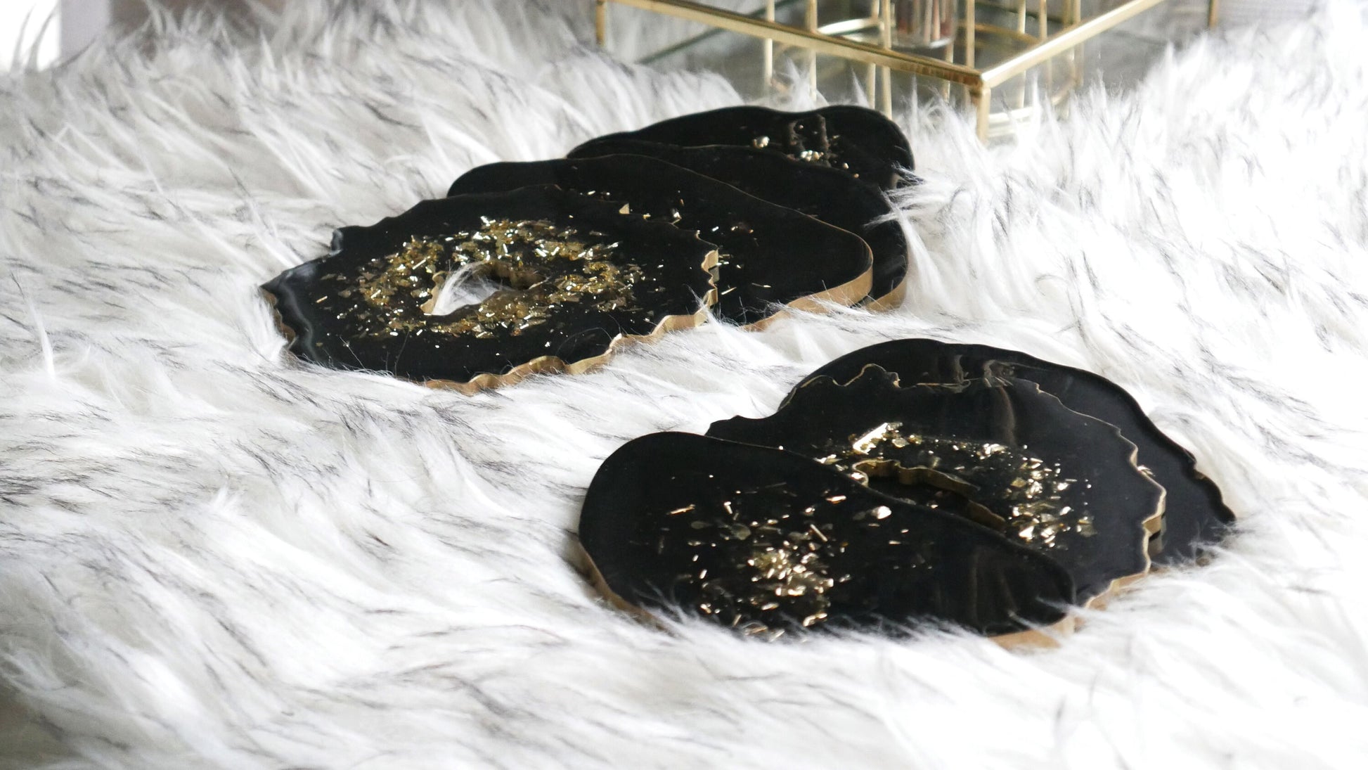 Ces sous-verres font partie d'un ensemble contenant un plateau en résine : https://www.etsy.com/listing/948641819/black-resin-tray-with-gold-handles-with?ref=listings_manager_grid