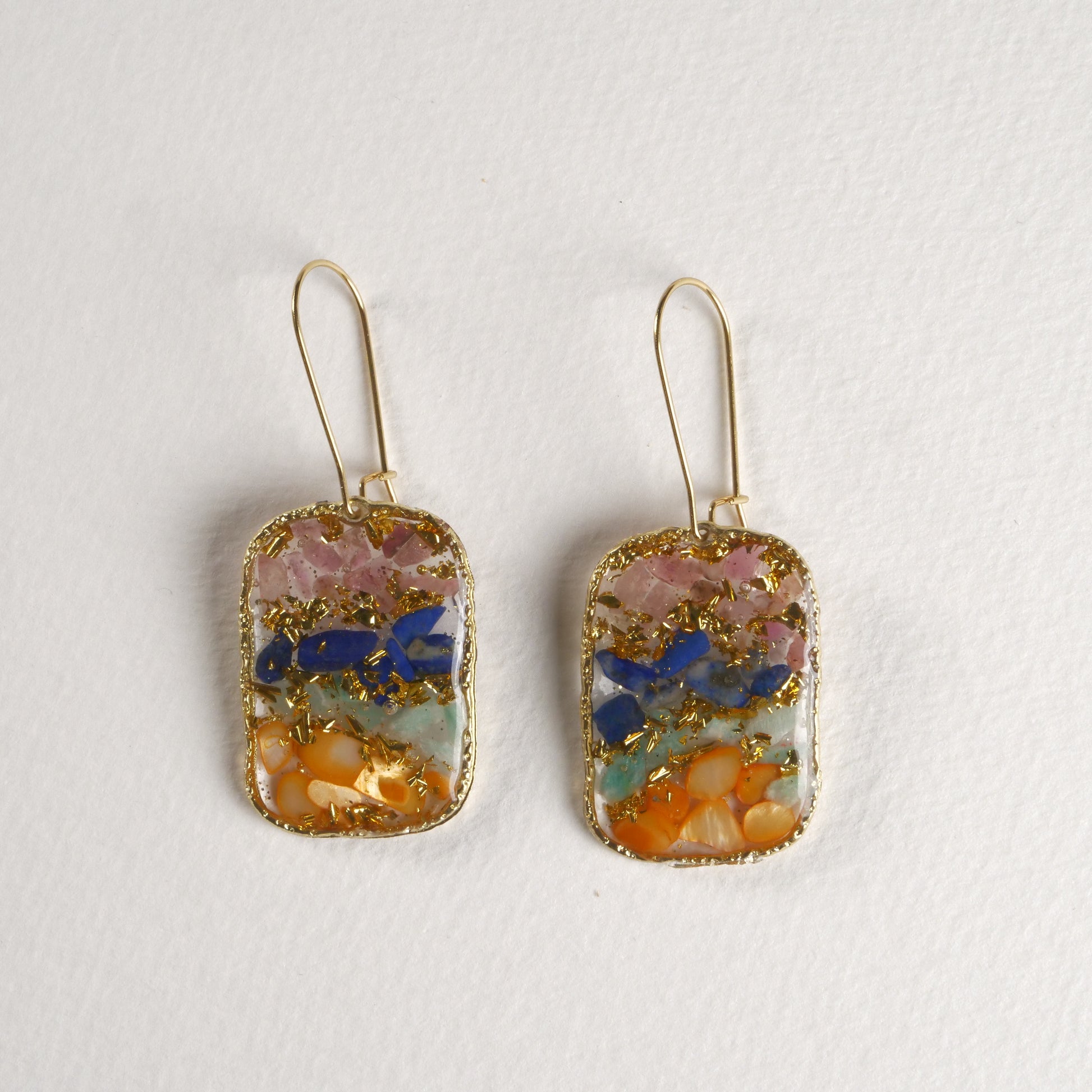 Boucle d'oreille en forme de monolithe en résine encadrent des éclats de pierres précieuses naturelles superposées et éclatantes, créant un superbe motif à étages.