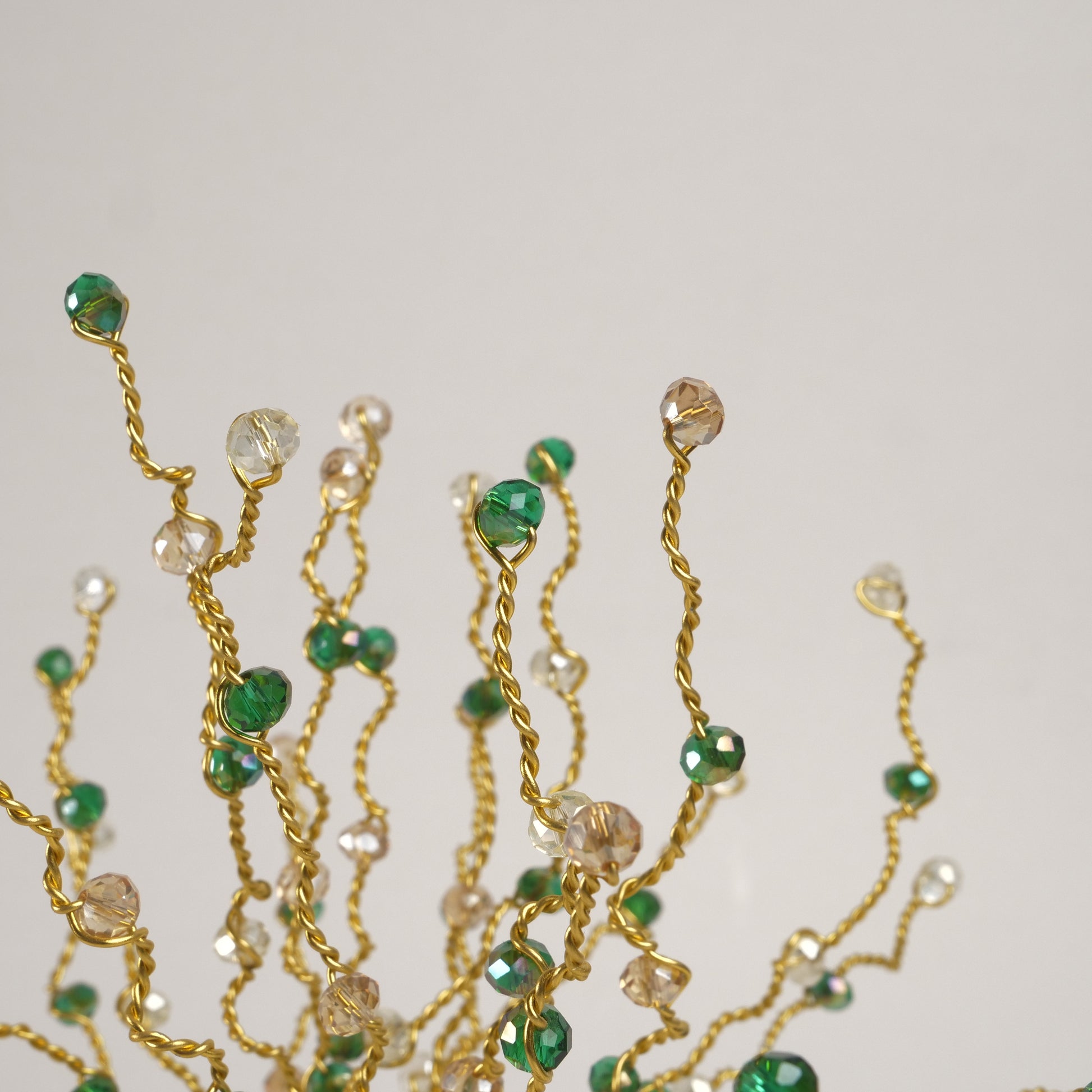 Gilded wire branches adorned with sparkling green beads, creating a vibrant, luminous canopy. Securely mounted on a circular green resin base for a fresh, elegant display.
