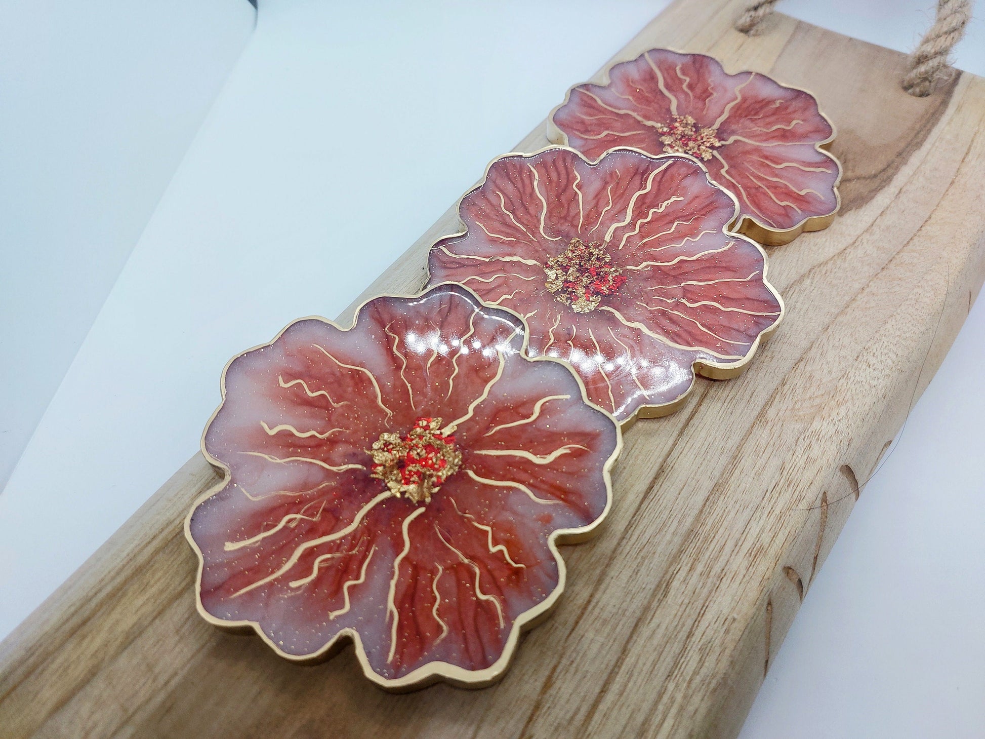 Those handmade resin items have a Red and white color with gold leaves in it giving all its elegance and charm to the object. Perfect to decorate your interior, place your drinks on, display your jewelry, your perfumes or to give as a gift.