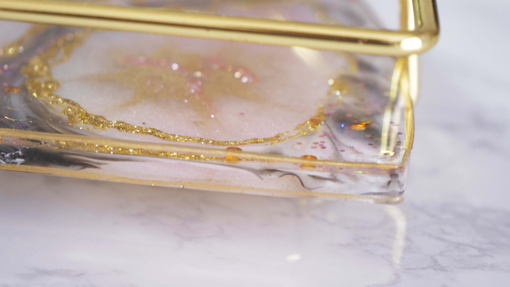 This tray handmade in resin with a beautiful golden stand has a geode design with sparkly glitters and colored beads. Perfect to decorate your interior, place your drinks on, display your jewelry, your perfumes or to give as a gift.