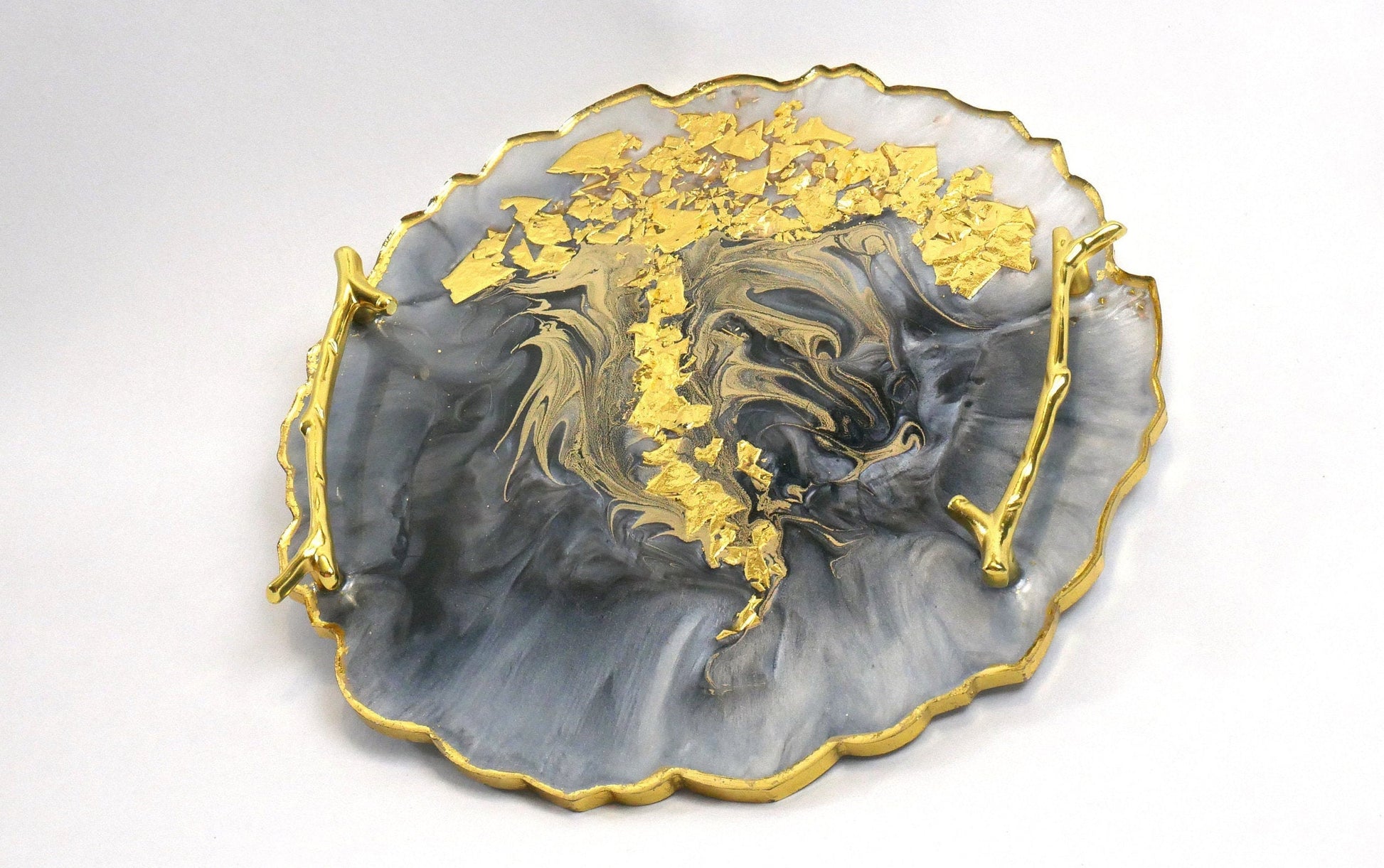 A beautiful handmade resin tray with elegant gold handles. The grey colors were added to the liquid to give a marble style and the gold leaves create an abstract figure of a gold tree. Perfect if you want to add a bit of luxury to your place.