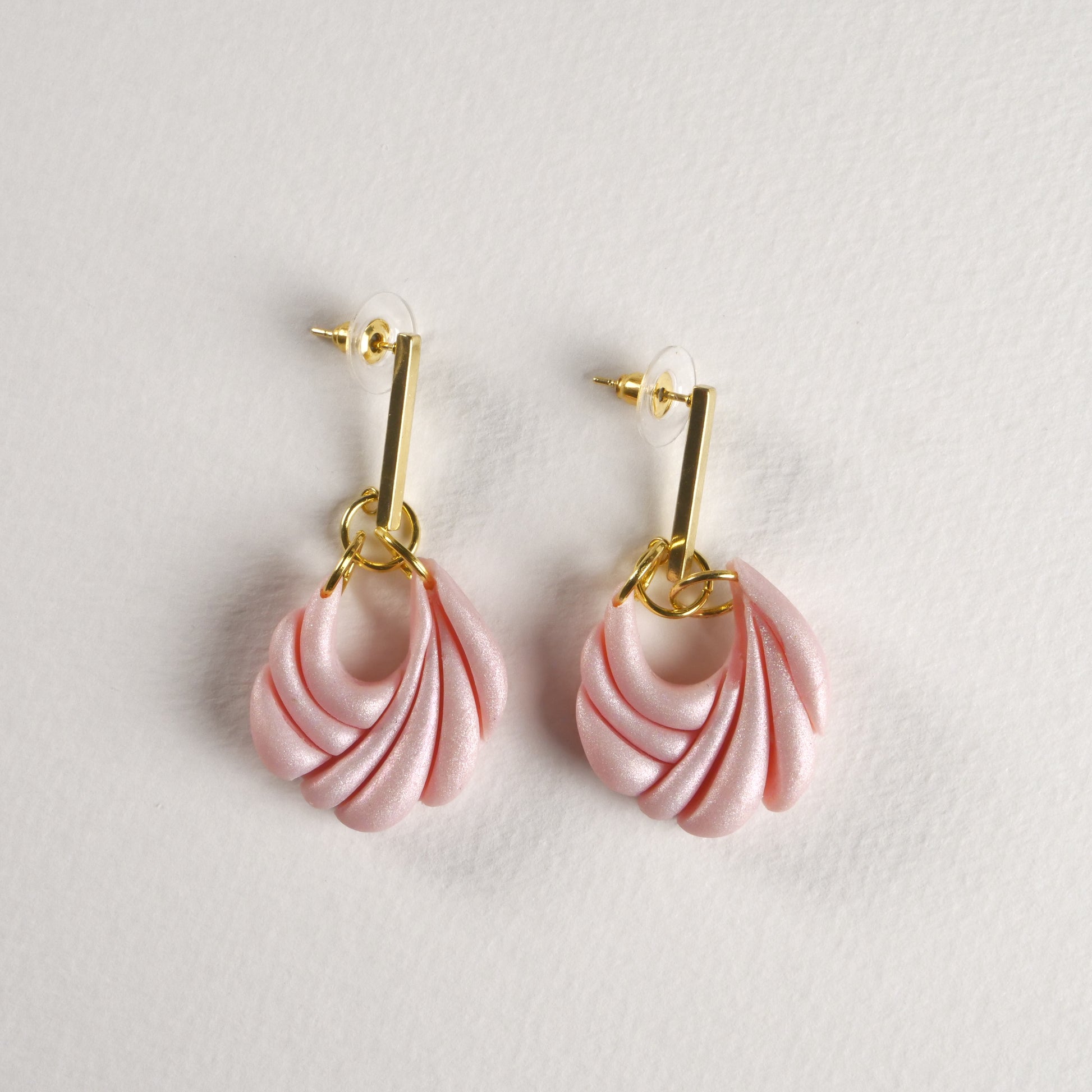 Delicate pink drops featuring a beautifully draped, iridescent polymer clay texture. A unique seashell-inspired form, suspended from a chic, minimalist gold bar stud.