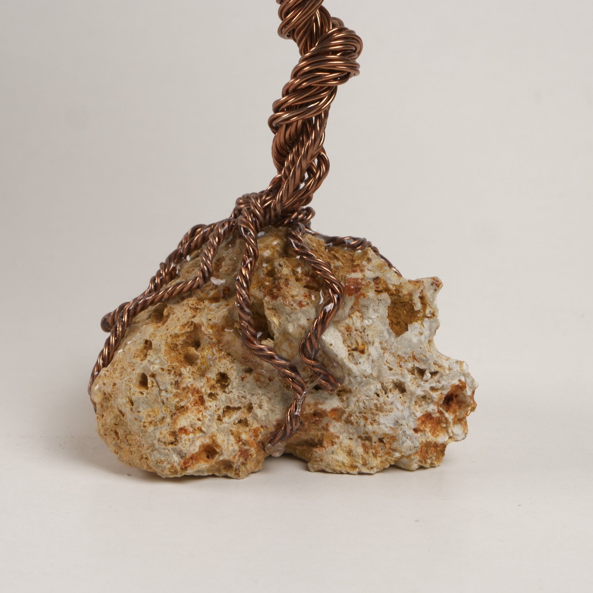 A gracefully curved tree with fine emerald green beaded wire creating a weeping willow canopy. Set upon a textured natural stone base, embodying serenity and organic beauty.